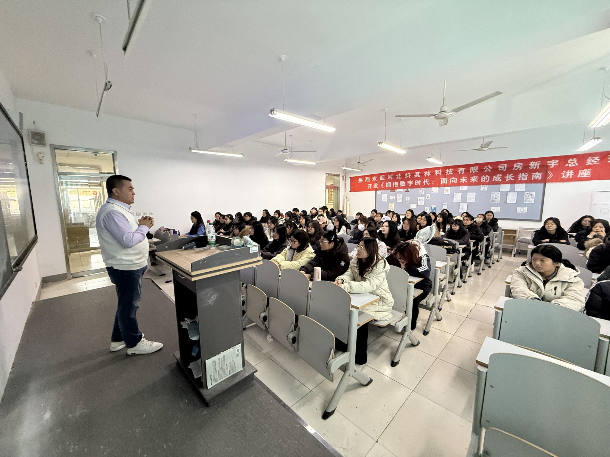 为帮助市场营销专业新生把握数字化浪潮下的行业动向,明确学习目标与职业路径,2025年12月5日,河北抖其林科技有限公司总经理房新宇受邀来到河北工程技术学院商学院,在次教108教室为2025级市场营销专业学生带来题为《拥抱数字时代,面向未来的成长指南》的专题讲座。