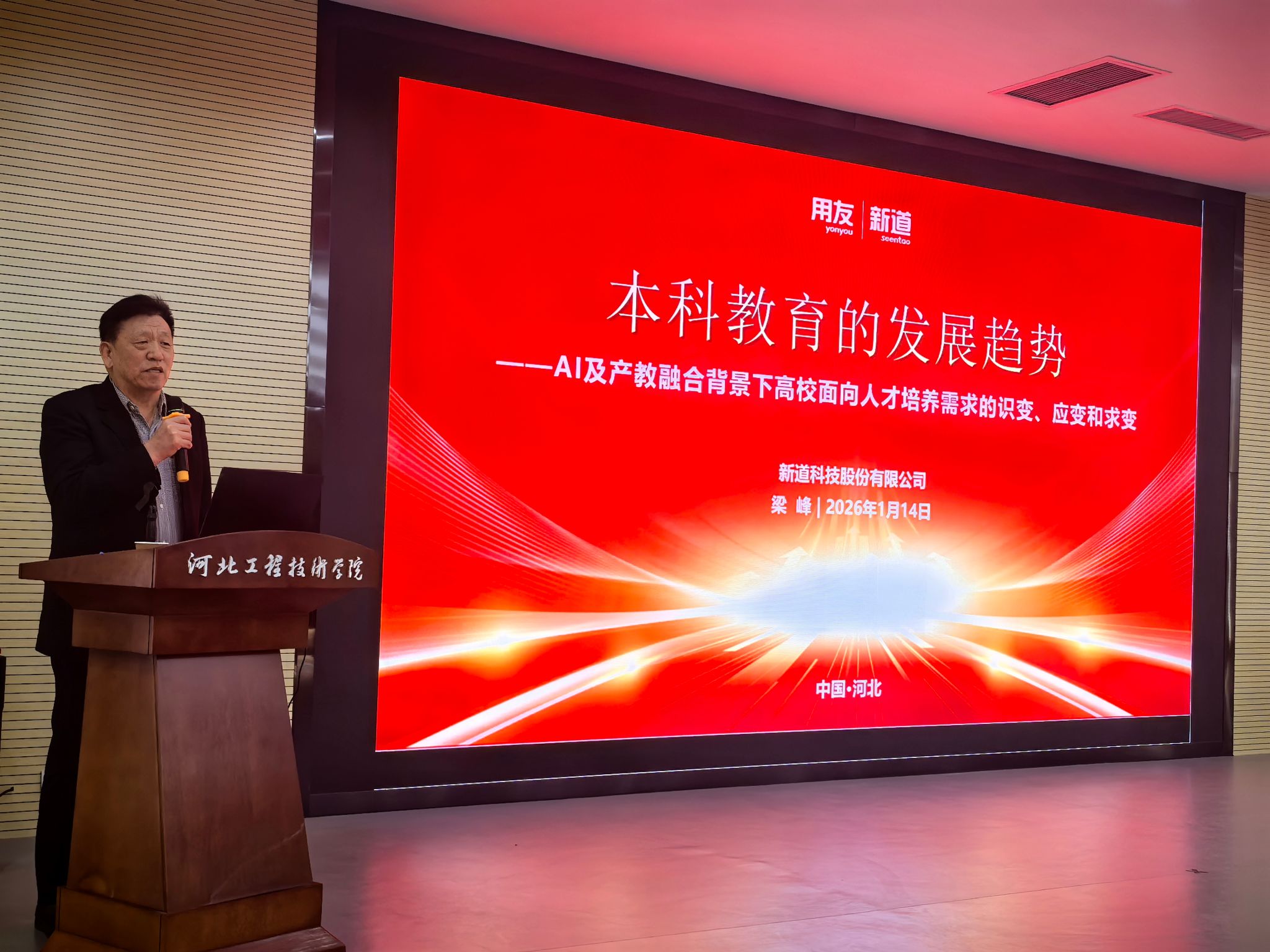 揭牌仪式后,学术报告环节如期举行。新道科技股份有限公司首席专家、教授、硕士研究生导师梁峰受邀作题为《本科教育的发展趋势 ——AI 及产教融合背景下高校面向人才培养需求的识变、应变、求变》的主旨报告。作为国家财政部教材编审委员会委员、教育部本科教学工作审核评估专家,梁峰教授拥有丰富的高校管理与科研经验,曾主持国家社科基金项目、省级科研项目 30 余项,出版专著教材 100 余部,发表核心期刊论文 60 余篇,斩获多项国家及省级科研、教学成果奖励。 报告中,梁峰教授紧扣 AI 时代发展脉搏与产教融合政策导向,深入浅出地解析了当前本科教育面临的机遇与挑战,提出了高校人才培养 “识变、应变、求变” 的核心路径。其分享的新理念、新思路,为河北工程技术学院深化教育教学改革、优化人才培养方案提供了重要借鉴,赢得了现场教师的热烈反响与阵阵掌声。 据悉,河北工程技术学院区域企业数智化产教融合实践中心将以 “数字赋能、交叉融合、服务社会” 为核心指引,聚焦高素质应用型人才培养,搭建校企合作、产学研协同创新的桥梁,力争成为助力区域经济高质量发展的重要平台。