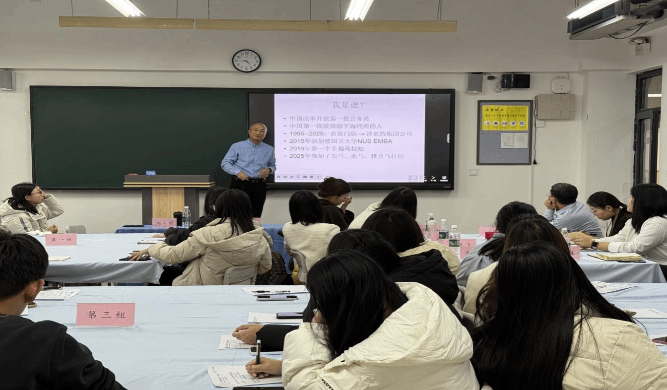 在主题分享环节,各位企业家结合自身创业经历与行业洞察,开启了创新创业专题授课。王宁老师结合自身从高校教师到成功创办多家企业的经历,精辟剖析了就业与创业在价值逻辑、风险责任上的异同,鼓励学生“就业练内功,创业搭舞台”。深耕行业三十年的郭兴国先生,作为改革开放后的第一代创业者,以“老创业人对你说”的坦诚姿态,分享了跨越时代的创业心得。他强调了价值观、持续学习和强健体魄对创业者的深远影响,并寄语青年“树立利益众生的使命观”,珍惜时间财富,勇敢实践。企业家刘彦超先生则结合其现代企业管理经验,围绕创业心态、机会捕捉与资源整合发表了精彩演讲,为同学们提供了宝贵的现实参考。
